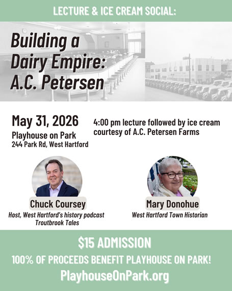 Drawing from Petersen family archives and new research, Chuck Coursey, host and producer of West Hartford’s history podcast Troutbrook Tales, and Mary Donohue, West Hartford Town Historian, share the history of Danish immigrant Andrew C. Petersen’s dairy empire. The lecture will be held in the former milk delivery truck garage, now the Playhouse on Park Theater. And ice cream is included courtesy of the A.C. Petersen Restaurant next door!